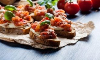Bagietkę lub chleb pokroić na cienkie kromki, podsmażyć na patelni z obu stron do uzyskania chrupiących grzanek.