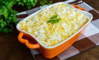 Najpierw gotujemy jajka, studzimy, obieramy. Zetrzeć na tarce.